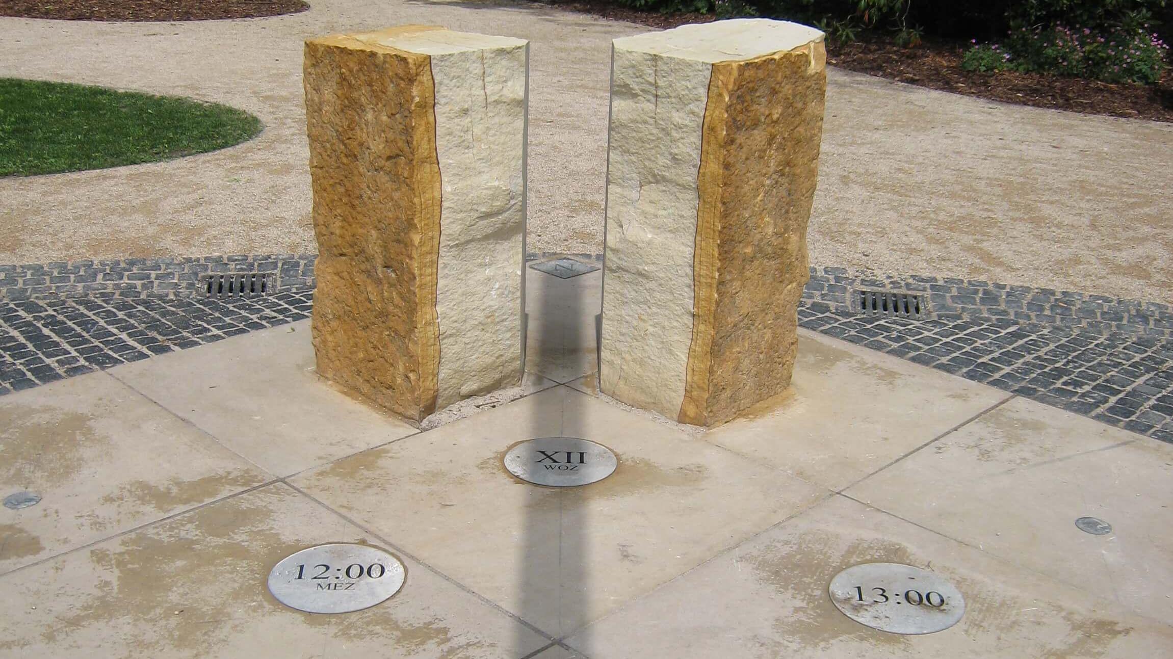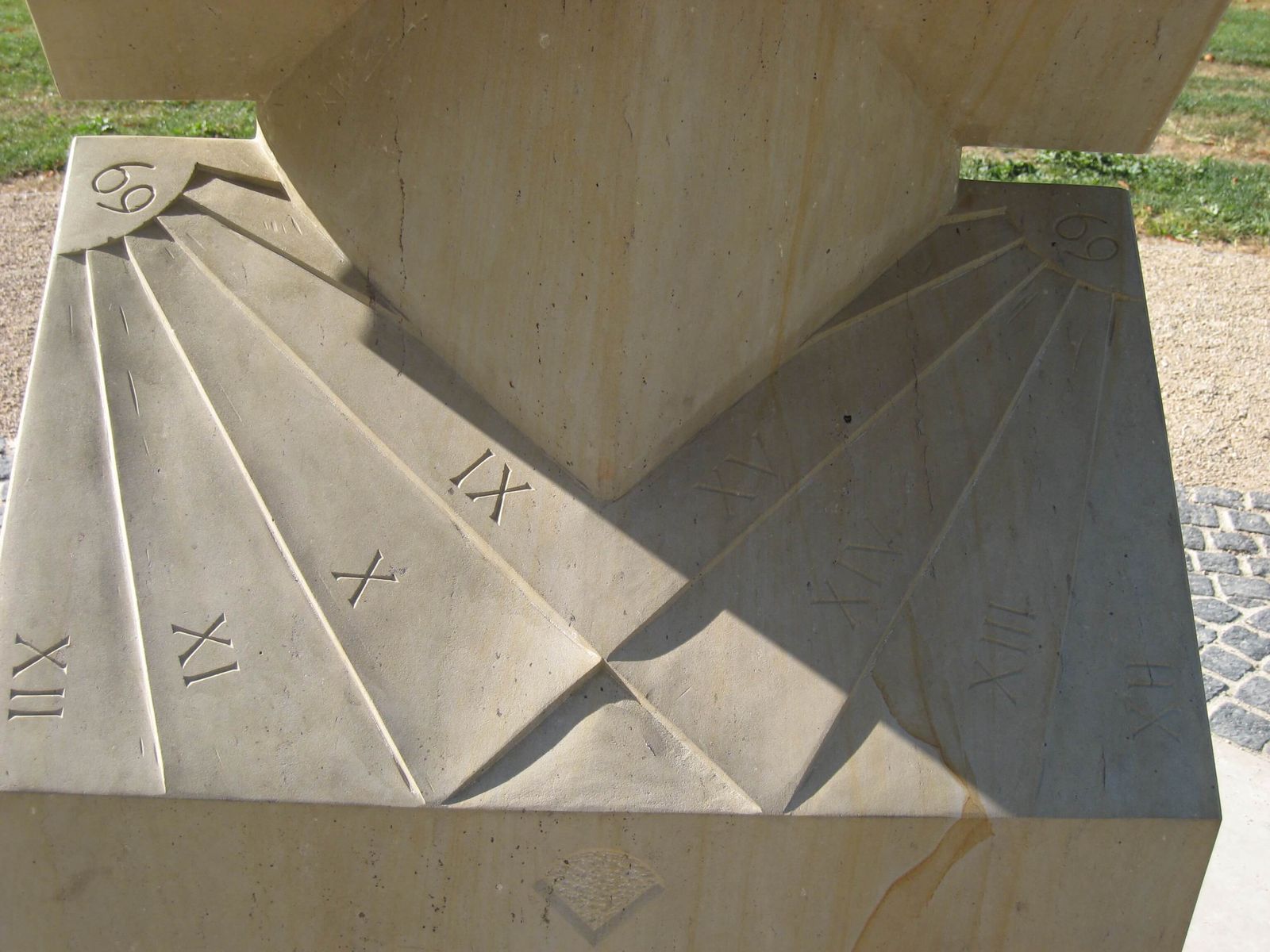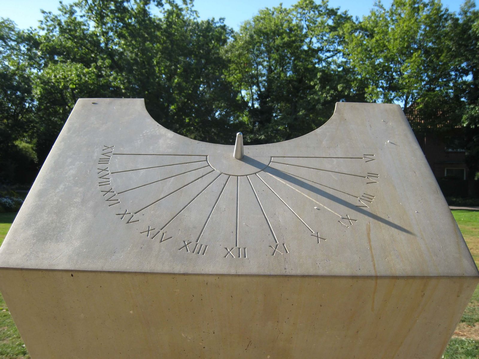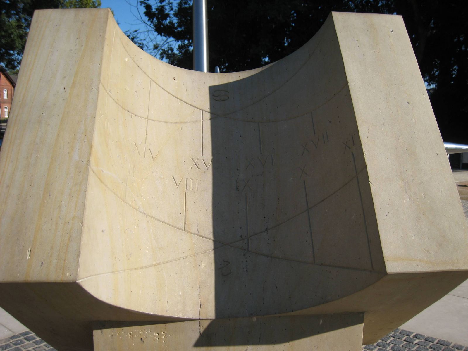 Der Schatten des Edelstahlstabes (Gnomon) weist auf den Zifferblättern mit den römischen Zahlen die wahre Ortszeit (WOZ) von Steinhude an, bei der um XII der Sonnenhöchststand angezeigt wird. Auf den Zifferblättern mit den arabischen Zahlen ist die Mitteleuropäische Zeit